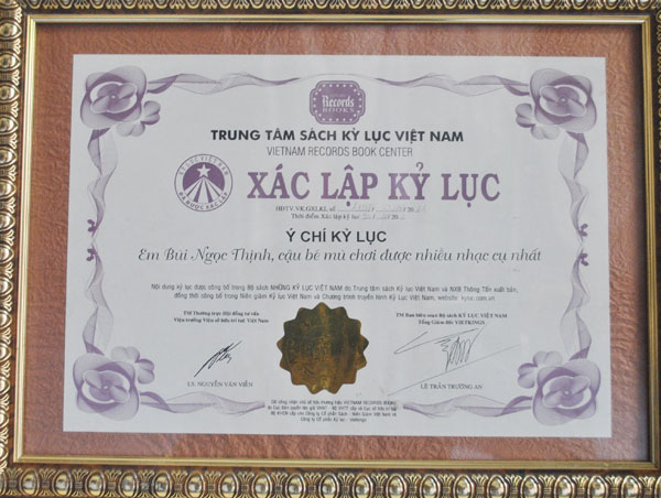 | Giấy chứng nhận của Trung tâm sách kỷ lục Việt Nam xác lập Bùi Ngọc Thịnh là cậu bé mù chơi được nhiều nhạc cụ nhất. |