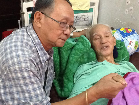 Nhà báo Thiên Hà chăm sóc nhà thơ Kiên Giang những ngày trước khi nhà thơ tạ thế (31/10/2014). |