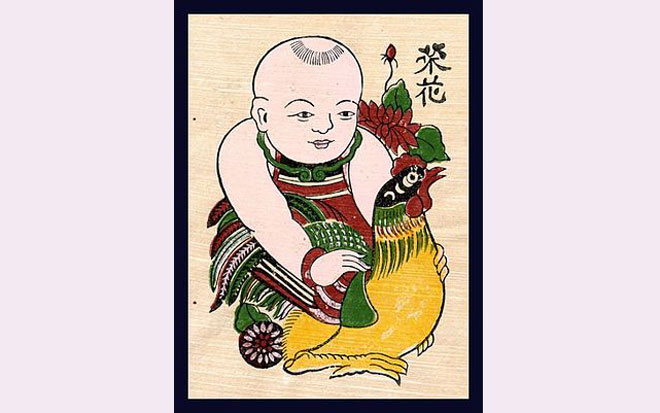 Xét về nghĩa thì gà trống âm Hán Việt là “đại kê” đồng âm với “đại cát” tức những điều tốt lành to lớn. Người xưa phú cho gà trống cái “ngũ đức” (5 phẩm chất) của người quân tử: Văn, Võ, Dũng, Nhân, Tín như hào hiệp chia sẻ thức ăn cho đồng loại, nhất là gà mái và gà con; đầu có mào như đội mũ đỏ oai vệ, thân có màu sặc sỡ; mỏ và chân cứng, lại thêm cựa nhọn làm vũ khí; quyết chiến không lui trước đối phương; tiếng gáy đúng giờ... Thì ra dân gian còn gửi vào bức tranh “Vinh hoa” cái ước ao cậu bé kia lớn lên có đủ 5 phẩm chất quý báu ấy!