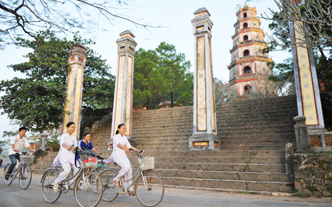 | Sáng sớm trước lối vào chùa Thiên Mụ (Huế). Ảnh: Nicolas Cornet |