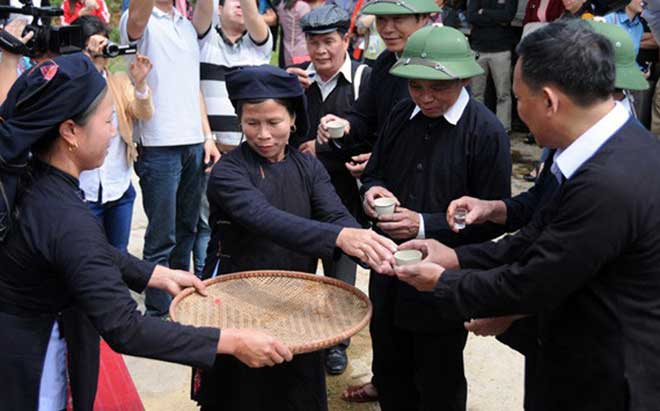 | Theo phong tục truyền thống, trong đám cưới của người Sán Chí, nhà trai phải uống rượu, hát đối thắng nhà gái. |