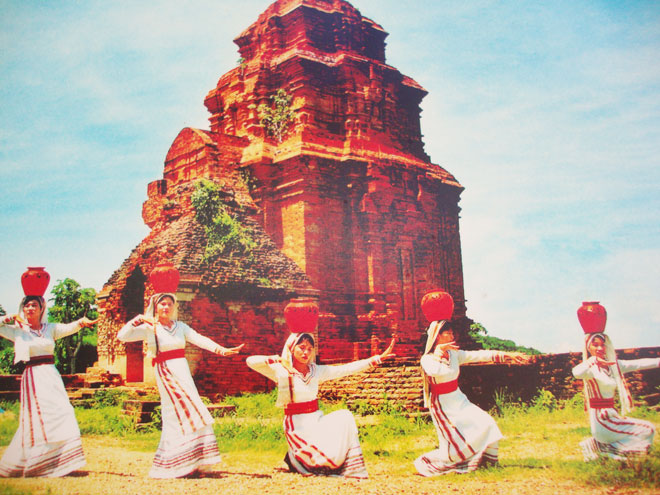 Lúc này đến bên tôi nhà thơ La Văn Tuân đọc những câu thơ Chăm được ghi lại bên tháp rằng: "Nỗi nhớ lóe lên như tia chớp/ Thắp lên ngọn buồn cháy buốt đêm đen/ Khóe mắt em ngơ ngác màn sương lạnh/ Bước giang hồ nhỏ lệ bên thềm…". Nắng bừng trên đồi tháp. Cụm lá bàng xanh biếc trên cao. Ngắm bức tượng nàng Apsara bên tháp cổ, tôi bỗng nhớ đến những câu thơ của thi sĩ Inrasa người Chăm đã viết: "Tôi khẽ chạm vào em/ Tôi vỗ mạnh vào em/ Em vỡ tiếng nói/ Em cất tiếng hát/ Khi tôi đánh thức em/ Đường nét và hình khối, dáng đứng với điệu cười. Apsara. Ap sa ra" (Apsara).