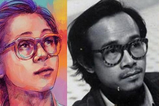 | Nhạc sĩ Trịnh Công Sơn (bên phải) và tạo hình nhân vật trong phim “Em và Trịnh”. |