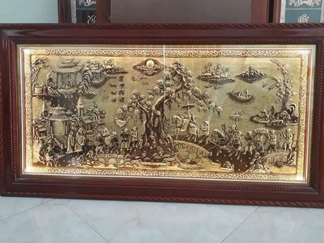 Không những thế, nghệ nhân Nguyễn Văn Điền còn nổi tiếng ở những tác phẩm tranh đồng cổ mang những tích chuyện và ý nghĩa nhân sinh. Hàng loạt tranh của ông được trưng bày như một phòng triển lãm vậy. Nào “Vinh quy bái tổ”, “Anh hùng tương ngộ”, “Mã đáo thành công”, hay “Phu thê viên mãn”, “Mừng thọ ông bà”
