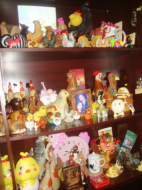 Anh “chăn” gà la liệt ở nhà,  rồi còn mang ra trưng một tủ đầy những chú gà ở ngay tại phòng làm việc. Nhiều vị khách đến làm việc cũng thích thú trò chơi này của anh. Có người còn gửi thêm cho anh những chú gà mới, bằng vải hay bằng gỗ nom rất ngộ.