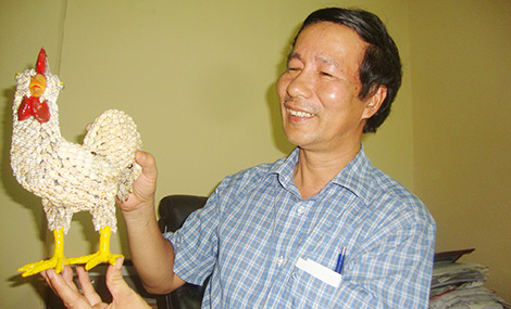 Nhà biên kịch Tô Hoàng Vũ với chú gà làm bằng ốc biển.