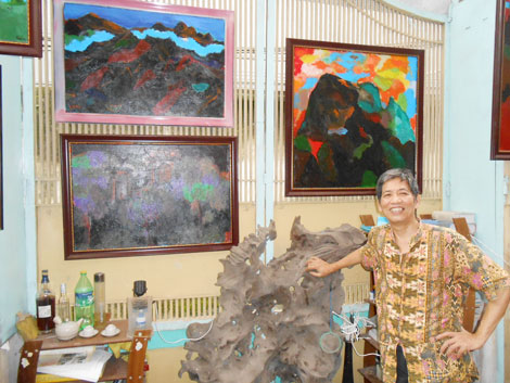 | Nhà văn Nguyễn Đình Chính bên xưởng vẽ. |
