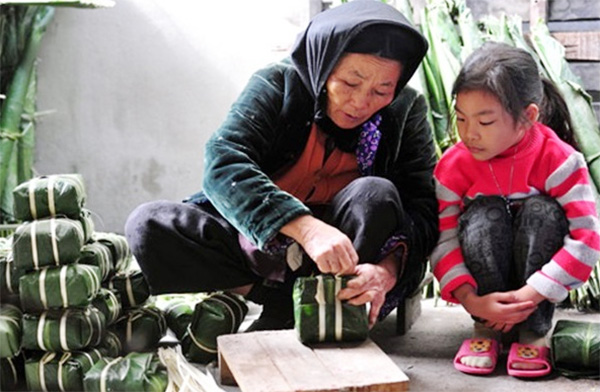 | Bà dạy cháu gói bánh chưng ngày Tết cổ truyền. |