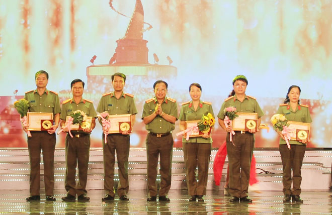 Trung tướng Mai Văn Hà (giữa) - Cục trưởng Cục Truyền thông CAND, Trưởng ban tổ chức Liên hoan Truyền hình - Phát thanh CAND lần thứ XII trao giải cho các tác phẩm dự thi "Chuyên mục an ninh trật tự" đoạt Huy chương Vàng.