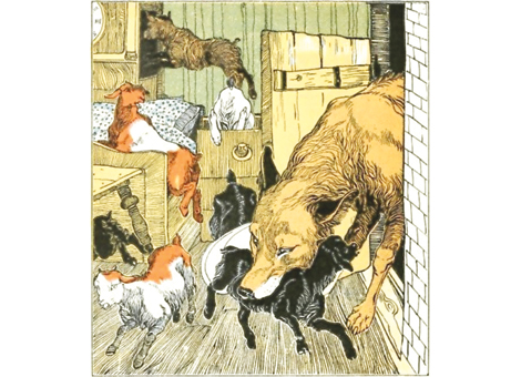 | Tranh minh họa truyện "Chú sói và bảy chú dê con" của anh em nhà Grimm. |