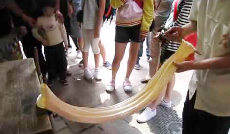 Lúc này đường luyện được đã dẻo như cao su. Ông bèn túm khăn bông khô lót tay và kéo nó ra thành thỏi. Mỗi thỏi dài nửa mét, to bằng ngón chân cái. Lúc này ông mới cắt thành từng viên nhỏ. Kẹo lăn lóc trong bột một lúc lâu chờ nguội hẳn, ông mới lấy nó ra bỏ vào từng lọ thủy tinh…