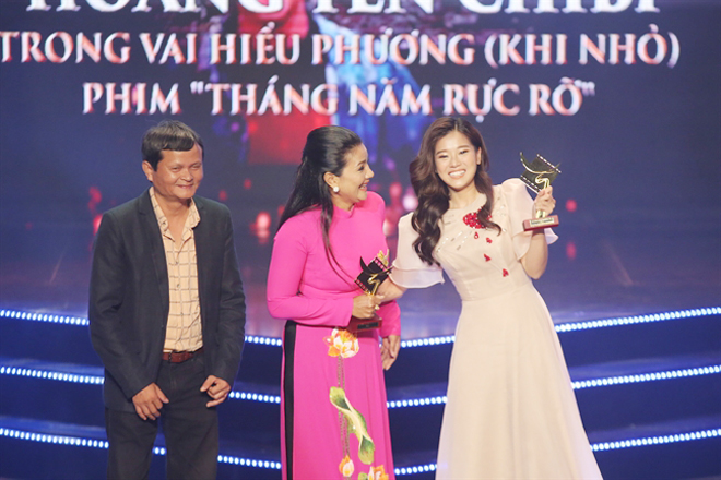 | Diễn viên Kiều Trinh (giữa, nhận giải thay cho Liên Bỉnh Phát) và Hoàng Yến Chibi (ngoài cùng bên phải) nhận giải thưởng Nam/Nữ diễn viên chính xuất sắc nhất hạng mục phim truyện điện ảnh. |