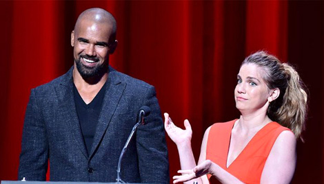 | Anna Chlumsky (phải) và Shemar Moore trong buổi lễ công bố danh sách đề cử cho lễ trao giải Primetime Emmy lần thứ 69. |