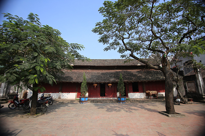 Cùng đôi câu đối là một bức hoành phi đề ba chữ: CỔ DĨ LÔI (Sấm vang trống giục) tạo tác năm Canh Thân (1920), đời vua Khải Định nhà Nguyễn. Ba chữ trên cũng được chạm lại trên hệ thống cửa võng trước gian thờ chính của đình. Cụ Nguyễn Văn Vưu, 93 tuổi, Đại tá hưu trí, nguyên Phó Cục trưởng Cục Quân lương (Tổng cục Hậu cần - Quân đội Nhân dân Việt Nam) chia sẻ: Ba chữ Cổ Dĩ Lôi có nghĩa là: Trống nổi lên rồi.