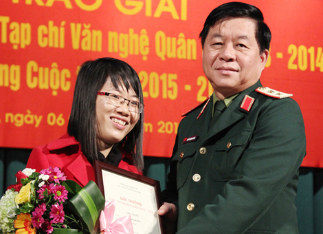 | Tác giả Nguyễn Thị Kim Hòa nhận giải nhất cuộc thi truyện ngắn của Tạp chí Văn nghệ Quân đội. |