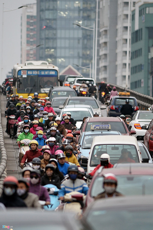 | Nhiều thời điểm, ôtô, xe máy chen lấn xếp thành 5-6 hàng kéo dài bởi đây là tuyến huyết mạch nối nội đô với cửa ngõ phía tây nam. |