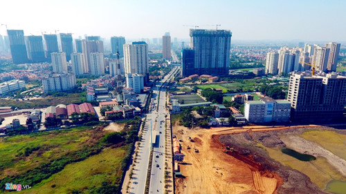 | Trong ảnh là điểm đầu của trục đường Lê Văn Lương - Tố Hữu. Bên phải khuôn hình là khu đô thị Trung Hòa - Nhân Chính. Càng về phía nam, các tòa cao ốc mọc càng dày đặc. |