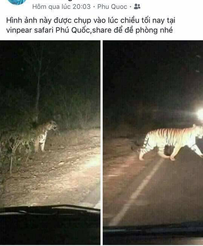 Theo đó, tối 7-3, trên mạng xã hội Facebook xuất hiện hình ảnh hai con hổ đứng ven bìa rừng và chạy qua đường được người ngồi trên ôtô chụp. Cá nhân đăng hình ảnh này kèm nội dung: “chụp vào chiều tối nay tại Vinpearl Safari Phú Quốc, share để phòng nhé”.