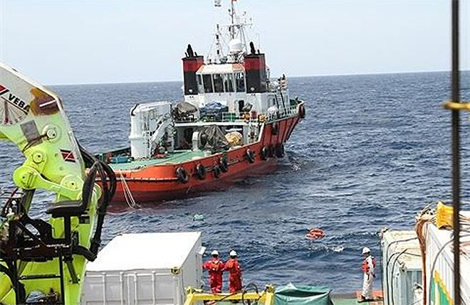 Lúc 15h30 ngày 11-7, robot lặn biển trên tàu TC 69 của Tổng Công ty Tân Cảng Sài Gòn đã thực hiện thành công thao tác móc đường dây neo của tàu cá NA 95899 vào cáp tàu TC 69.