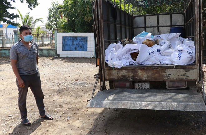 | Bùi Quốc Hưng cùng xe tai và số gà chết đang vân chuyển. |