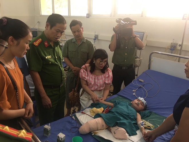 Chị Thơm và con trai chị là cháu Nguyễn Hoàng Phúc, 3 tuổi bị tảng đá to đè lên người, làm dập nát hai chân của cháu bé, chị Thơm cũng bị thương tích nặng ở chân và tay.