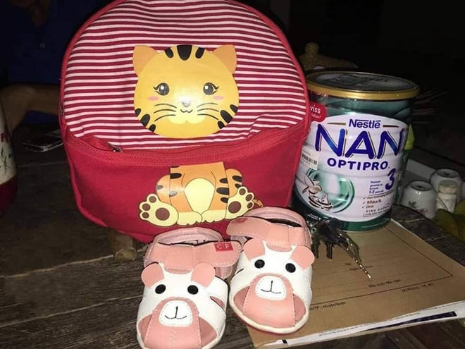 Bên cạnh cháu bé có 1 balo đỏ đựng quần áo, 1 đôi dép màu hồng, 1 hộp sữa bóc dở, 1 mẩu giấy nhỏ có ghi: “Tôi xin được giấu tên. Tôi sinh được bé trai sinh ngày 16-8-2018. Vì tôi không nuôi được nên gửi nhờ nhà chùa nuôi cháu hết đời. Tôi không vấn vương gì hết”.