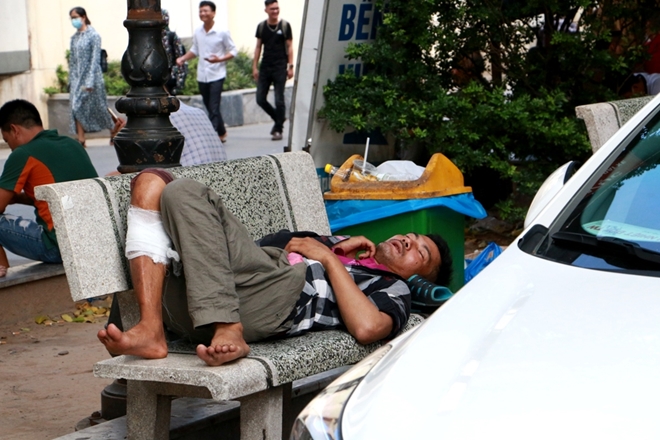 Dưới tiết trời nắng nóng nhiệt độ lên tới 40 độ C đến 45 độ C, người nhà bệnh nhân kiệt sức, mệt lả bất cứ chỗ nào có bóng râm cũng trở thành nơi ngả lưng.