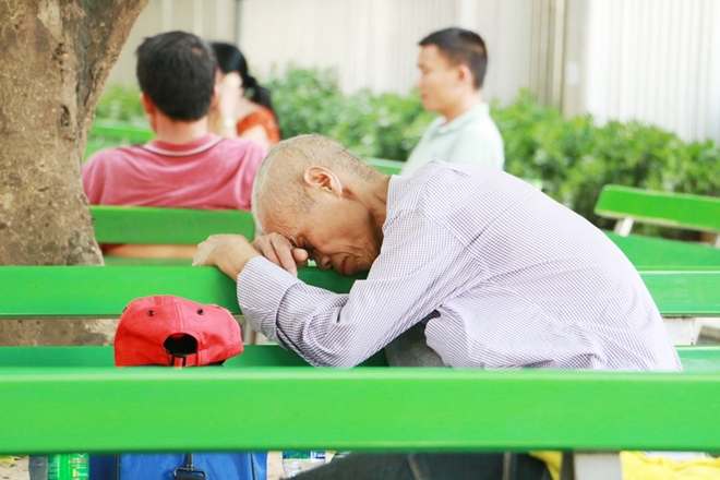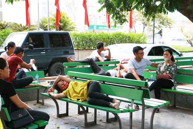 Dưới tiết trời nắng nóng nhiệt độ lên tới 40 độ C đến 45 độ C, người nhà bệnh nhân kiệt sức, mệt lả bất cứ chỗ nào có bóng râm cũng trở thành nơi ngả lưng.