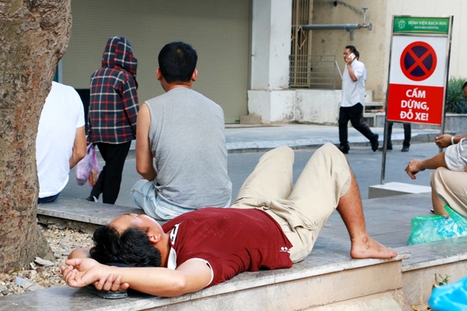 Bà Hoàng Thị Lan ở Quế Võ, Bắc Ninh chăm sóc con trai 18 tuổi tại bệnh viện Bạch Mai cho hay: “Chúng tôi rất vất vả, người nhà bệnh nhân không có chỗ ăn chỗ ngủ, phải nằm vạ vật ngoài hành lang, ngoài các ghế đá dưới tán cây. Thời tiết nắng nóng quá, không gian hành lang có hạn mà lượng người lại lớn nên chúng tôi nhiều người khi nghỉ ngơi vào buổi trưa phải ra ngoài ghế đá hay dưới các gốc cây để ngả lưng”.