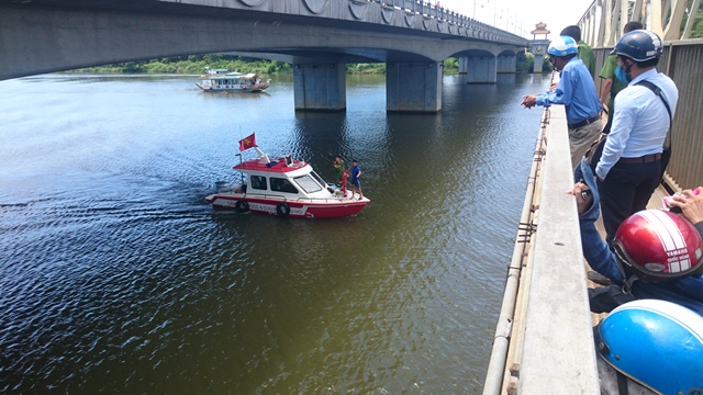 | Lực lượng cứu hộ tổ chức tìm kiếm tung tích cô gái nhảy sông Hương tự vẫn. |