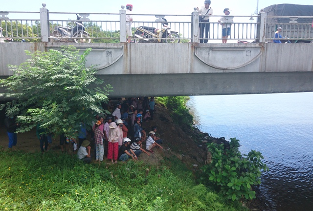 | Người thân và người đi đường theo dõi việc tìm kiếm nạn nhân bên bờ sông Hương. |
