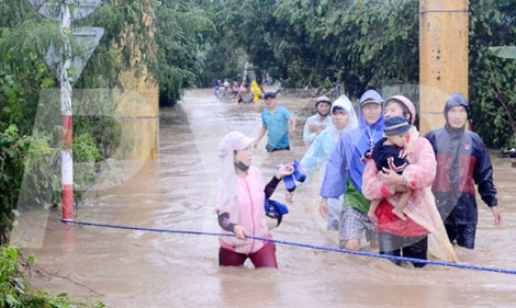 | Lực lượng chức năng đưa các cô giáo và học sinh tại trường mầm non xã An Hiệp ra ngoài an toàn sau 5 giờ dầm mình trong nước lũ, ảnh Ngọc Thắng. |