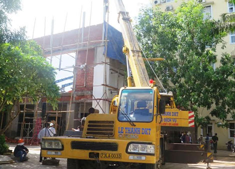 Lúc 9h sáng 9/10, xe cần cẩu của dịch vụ kinh doanh Lê Thanh DKT (có trụ sở ở Quảng Bình) mang BKS 73LA-0033, trong lúc tiến hành cẩu một khối lượng lớn vật tư vật liệu phục vụ xây dựng công trình cải tạo, nâng cấp nhà hàng khách sạn Hữu Nghị tại 68 Trần Hưng Đạo, phường 1, TP Đông Hà (Quảng Trị), đã bất ngờ gãy đôi.