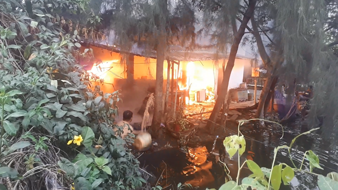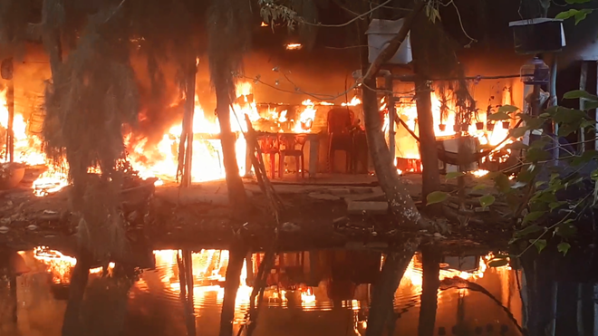 | Lửa bốc lên ngùn ngụt từ căn nhà cấp 4 của khu câu cá |
