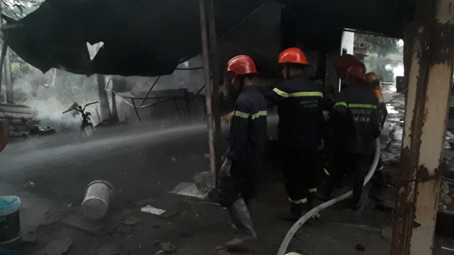 | Cán bộ chiến sĩ Cảnh sát PCCC quận 7 phun nước dập tắt đám cháy |