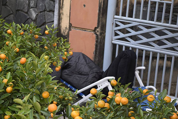 Người bán quất cảnh ngủ trên chiếc ghế xếp mang theo trong gió lạnh.