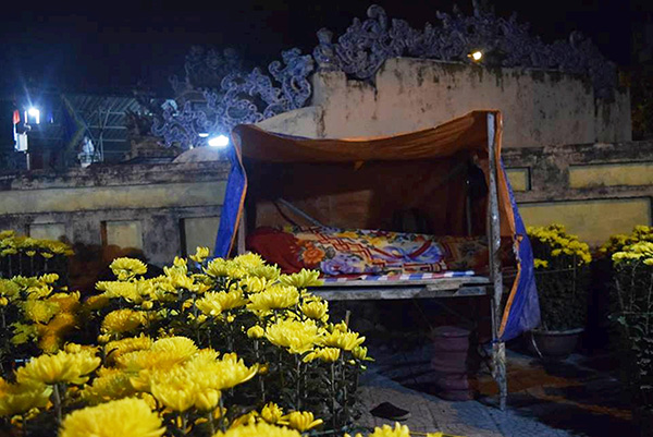 Nhiều người mượn giàn giáo công trình gần đó khi công nhân về nghỉ tết để dựng thành sạp căng bạt ngủ qua đêm. Một người bán mai khác cũng đến từ Bình Định mắc võng ngủ ngay bên vỉa hè đường Nguyễn Hữu Thọ...
