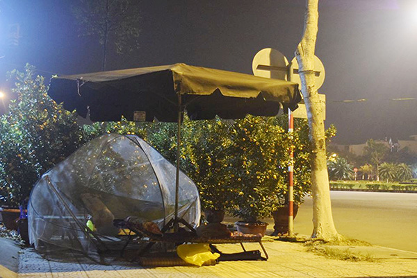 Hai người bán hoa trên đường 2-9 (Đà Nẵng) căng bạt tạm bợ trên bãi cỏ bên đường để lấy chỗ nghỉ qua đêm. Ban ngày họ phải dọn sạch để trả lại bãi cỏ như cũ.