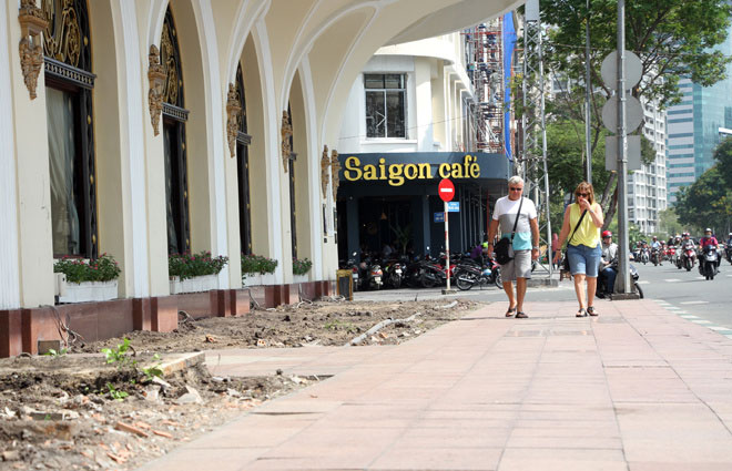 Vỉa hè khách sạn Majestic sau 4 ngày bị đoàn liên ngành quận 1 đập bỏ các tiểu cảnh, thu giữ chậu kiểng chiếm vỉa hè.