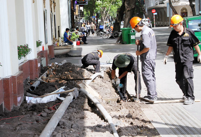 Khu vực này còn ngổn ngang ống nước, gạch đá... Trước đó, các hạng mục của khách sạn 5 sao này lấn vỉa hè khoảng 3 m trên chiều dài 30 m ở hai mặt đường Đồng Khởi và Tôn Đức Thắng.