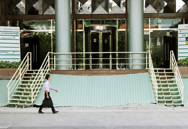 Bậc thềm của tòa nhà VTP trên phố đi bộ Nguyễn Huệ chưa khắc phục xong sau 20 ngày bị phá bỏ phần lấn chiếm. Tòa nhà cho thiết kế lại lối lên xuống với cầu thang sắt 2 bên.