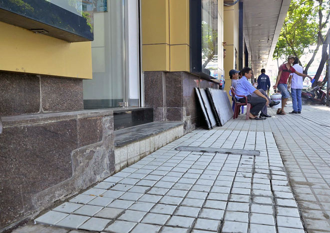 Gần đó, 9 bậc thềm của khách sạn New World (mặt đường Phạm Hồng Thái) lấn vỉa hè 1,5-2 m đã được khắc phục xong. Những bậc tam cấp được làm lùi vào trong giúp khách ra vào các cửa hàng mà khách sạn cho thuê.