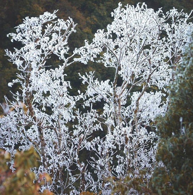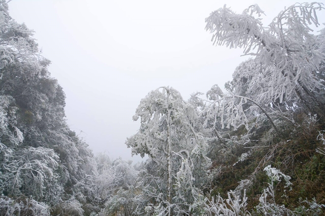 Ảnh hưởng của đợt không khí lạnh được các chuyện gia đánh giá là mạnh nhất trong mùa đông năm nay, từ chiều 10-1, nhiệt độ tại khu vực đỉnh núi Trống Páo Sang (xã La Pán Tẩn, huyện Mù Cang Chải, Yên Bái) xuống thấp dưới 0 độ C khiến băng tuyết xuất hiện dày đặc.