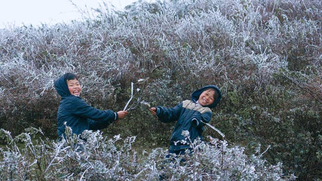 | Hai em nhỏ vùng cao rạng rỡ vui đùa trong băng tuyết lạnh giá. |