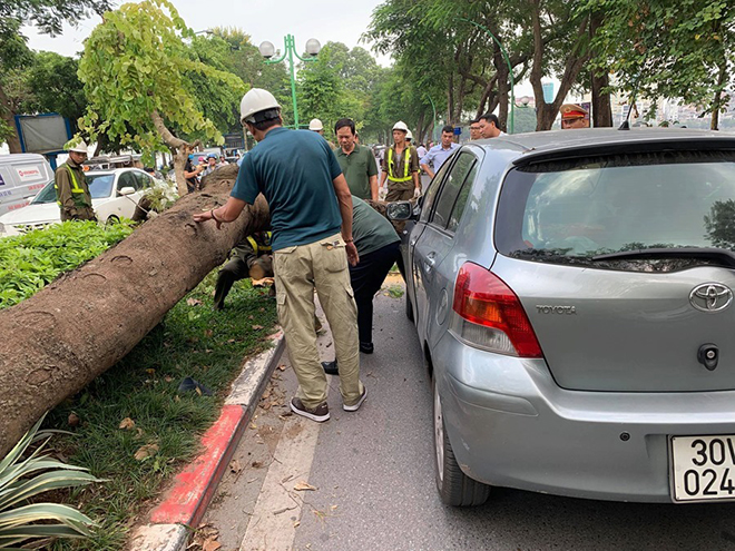 Cây xanh có thân gốc khá lớn, khoảng 2 người ôm, gốc bị mục ruỗng, gãy đổ trong phần giữa dải phân cách 2 làn đường Thanh Niên. Một phần thân cây đè trúng mũi xe ô tô.