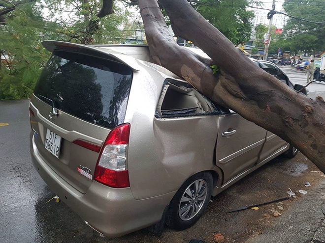| Chiếc xe bị cây xanh bật gốc đè hư hỏng nặng |