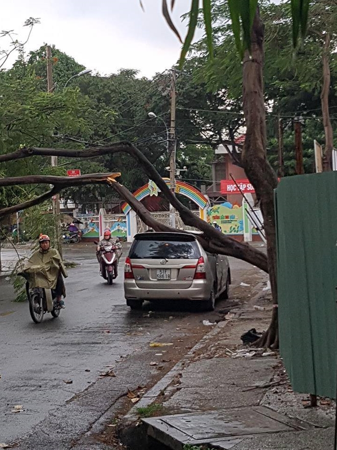 Lúc này trời đang mưa to, tài xế cho xe tấp vào lề dừng đỗ thì bất ngờ 1 cây xanh tại đây bật gốc ngã đè lên xe ôtô làm hư hỏng nặng. Tài xế hoảng hốt tung cửa thoát ra ngoài.