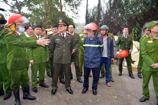 | Đại tá Nguyễn Hữu Cầu, Giám đốc Công an tỉnh đã trực tiếp đến hiện trường chỉ đạo công tác dập lửa. |