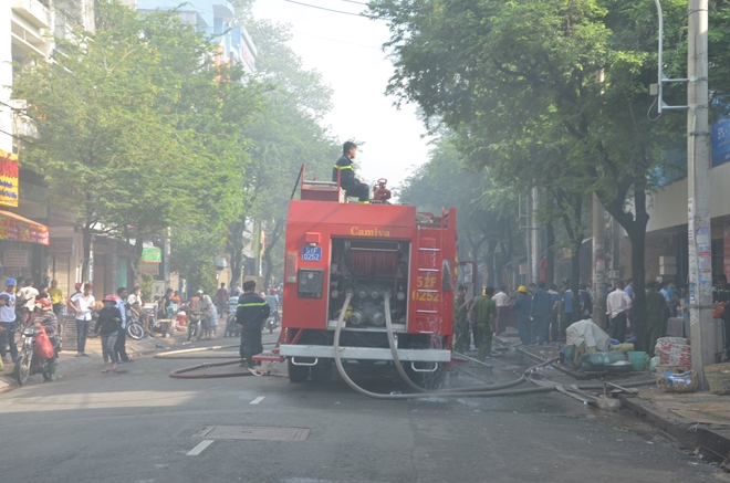 CSGT - Công an quận 5 và các đơn vị lực lượng khác đã tiến hành phong tỏa hiện trường phục vụ công tác chữa cháy. Tiểu thương buôn bán bên dưới tầng trệt của siêu thị cũng di dời tài sản ra ngoài để tránh đám cháy lan vào.