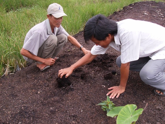 | Lớp than bùn ở xã Khánh An, huyện U Minh (Cà Mau) cháy âm ỉ mấy ngày nay. |